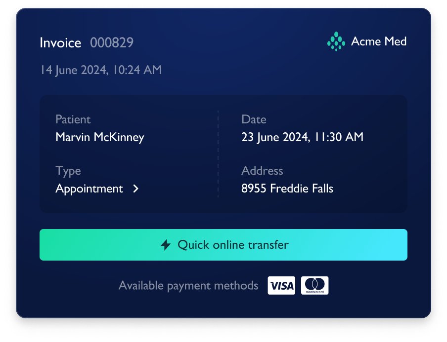 Take payments electronically 24/7. Generate and email PDF invoices to self-pay patients as soon as a booking is made, complete with a link to instantly pay online by credit or debit card. A receipt is automatically generated and sent to the patient, and your accounts in Carebit updated.