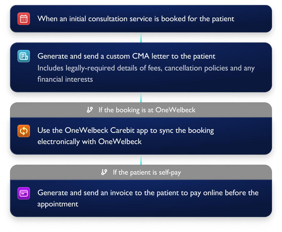 Easily build your own Workflows to automate tasks that traditionally would be performed manually. Automatically generate custom letters and emails, copy correspondence to hospitals, send booking and invoice reminders, and more. Carebit even comes preinstalled with Workflows and templates for common tasks, or just ask our Support team to build one for you.